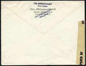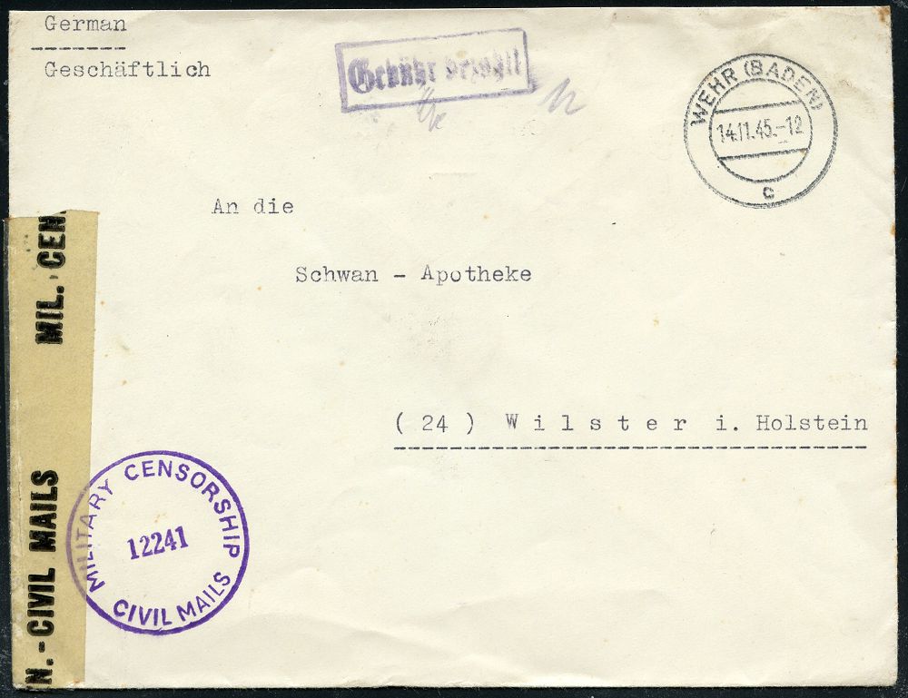 5829 | 20 € | POSTLEITRAUM 7800 (OHNE FREIBURG) : WEHR (BADEN)/ c 1945 (14.11.) 2K-Steg + schw. Ra.: Gebühr bezahlt + US Zensurstreifen: EXAMINED BY/ MIL.-CEN.-CIVIL MAILS + viol. Zenur-1K: MILITARY CENSORSHIP/ 12241/ CIVIL MAIL (= Offenbach) rs. Abs.-Vordruck: CIBA AG, Berlin-Wilmersdorf überstempelt CIBA AG, Wehr.., Inl.-Zensur-Bf. n. Wilster/Holst. | ![]() ![]() | |