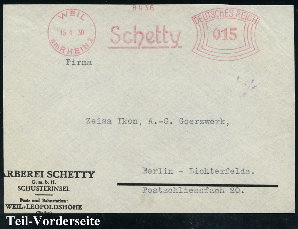 5835 | 15 € | POSTLEITRAUM 7800 (OHNE FREIBURG) : WEIL/ am RHEIN 1/ Schetty 1930 (15.1.) AFS Francotyp "Bogenrechteck" auf Teil-Vorderseite: ARBEREI SCHETTY GmbH, SCHUSTERINSEL.. (Dü.E-1CEh) | ![]() | |