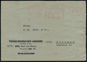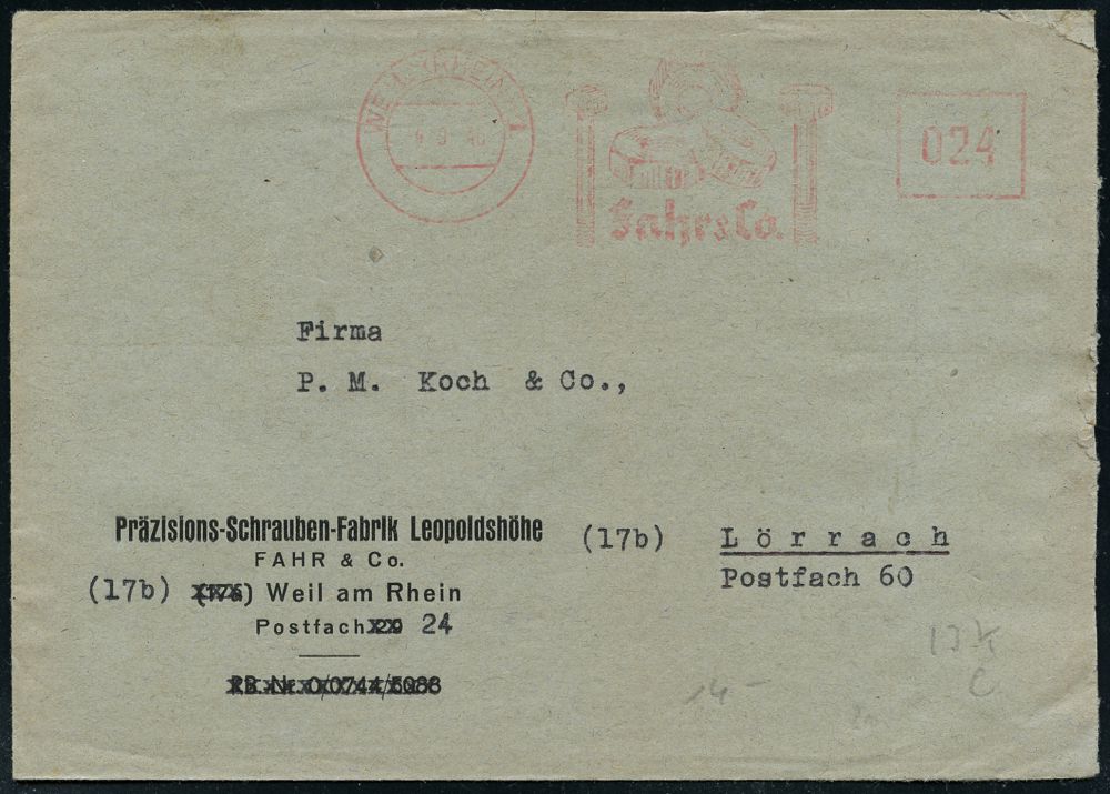 5838 | 20 € | POSTLEITRAUM 7800 (OHNE FREIBURG) : WEIL (RHEIN) 1/ Fahr & Co.. 1946 (4.8.) aptierter AFS Francotyp "Reichsadler" = entfernt + Inschrift "Deutsche Reichspost" = Notmaßnahme! (Abdruck zeitbedingt etw. hell) Firmen-Bf.: Präzisions-Schrauben.Fabrik Leopoldshöhe, FAHR & Co.. (kl. Randmäng.) Fern-Bf. (Dü.E-13 AU-129o) | ![]() | |