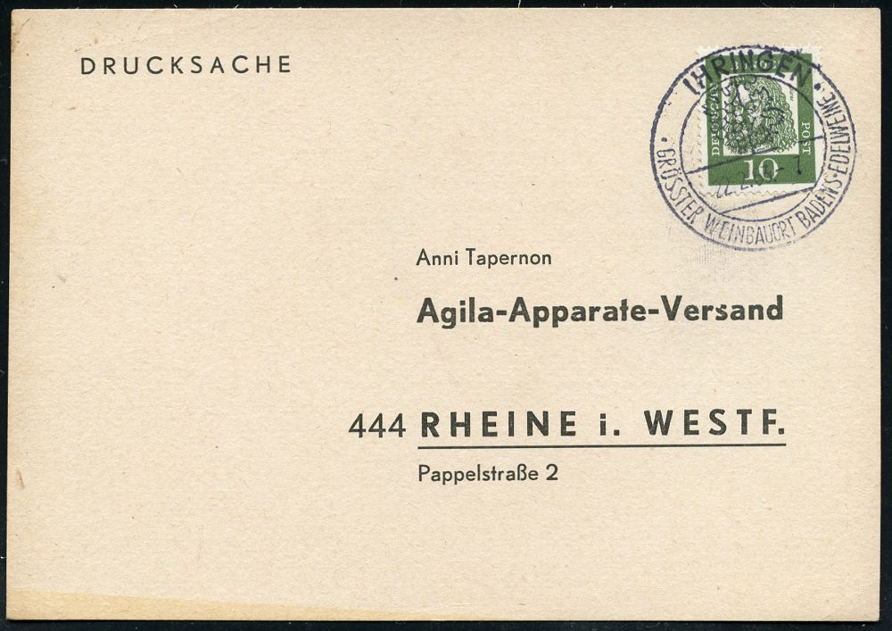5712 | 11 € | POSTLEITRAUM 7800 (OHNE FREIBURG) : IHRINGEN/ GRÖSSTER WEINBAUORT BADENS EDELWEINE 1963 (22.2.) aptierter HWSt = alte PLGZ entfernt (Weintraube) Firmen-Kt.: Agila-Apparate-Versand (Bo.3 aptiert) | ![]() ![]() | |