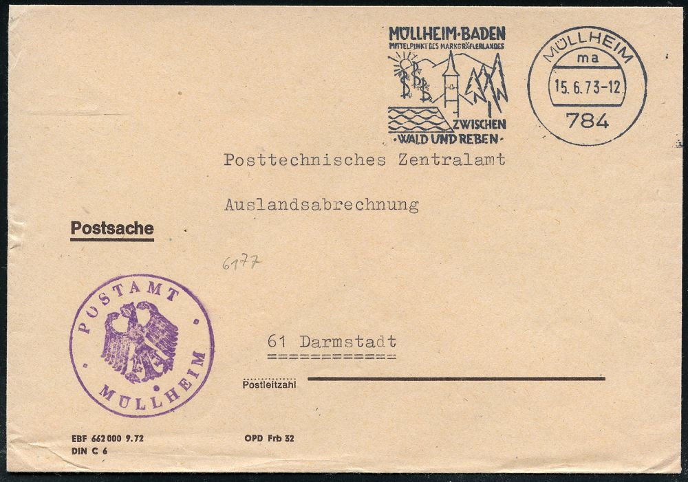 5743 | 8 € | POSTLEITRAUM 7800 (OHNE FREIBURG) : 784 MÜLLHEIM/ ma/ ..ZWISCHEN/ WALD U.REBEN 1973 (15.6.) MWSt. (Ort, Weinstöcke) + viol. 1K-HdN: POSTAMT/ MÜLLHEIM (Adler) portofreier Postdienst-Bf. (Bo.6 A I) | ![]() | |