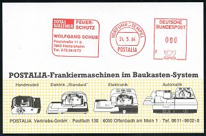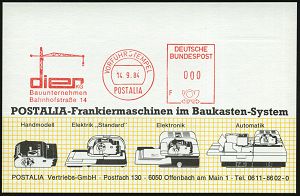 5667 | 18 € | POSTLEITRAUM 7800 (OHNE FREIBURG) : Bötzingen 1984 (14.9.) AFS.: VORFÜHRSTEMPEL/POSTALIA/dier KG/Bauunternehmungen.. = Bau-Kran , seltene Postalia-Musterkt.! (= Specimen) | ![]() | |