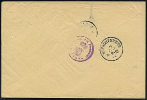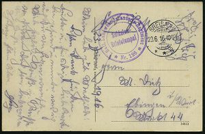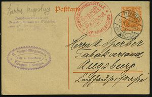 5795 | 15 € | POSTLEITRAUM 7800 (OHNE FREIBURG) : TIENGEN/ a/ (AMT WALDSHUT) 1918 (15.6.) 1K-Brücke + roter Zensur-1K: UEBERWACHUNGSSTELLE/ Geprüft/ *WALDSHUT*/ XIV.ARMEEKORPS (Rie.4, rot) + viol. 4L: Handelserlaubnis.., Inl.-Zensur-P 7 1/2 Pf. Germania n. Augsburg (Mi.P 110) | ![]() | |