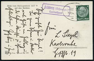 5682 | 16 € | POSTLEITRAUM 7800 (OHNE FREIBURG) : Feldberg (Schwarzw.)/ Caritashaus 1935 viol. Ra.2 = Hauspostamt PSt.II + undeutl. Bahn-Oval Zug 1934, s/w.-Foto-Ak.: Blick auf den Belchen, Bedarf (Mi.516) | ![]() ![]() | |
