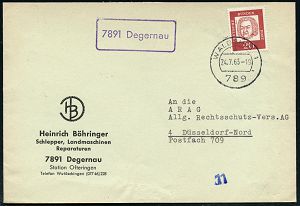 5671 | 12 € | POSTLEITRAUM 7800 (OHNE FREIBURG) : 7891 Degernau 1963 (24.7.) viol. Ra = PSt.II + 1K-Segment: 789 WALDSHUT 1/k , Firmen-Bf.: H.Böhringer/Schlepper.. (Mi.352/EF) | ![]() | |