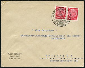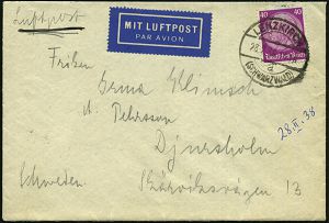 5721 | 18 € | POSTLEITRAUM 7800 (OHNE FREIBURG) : LENZKIRCH/ a/ (SCHWARZWALD) 1938 (28.2.) 1K-Brücke auf EF 40 Pf. Hindenbg., , portorichtiger, kleiner Ausl.-Flugpost-Bf. n. Schweden (Mi.524 EF) | ![]() | |