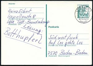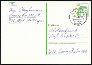 5735 | 8 € | POSTLEITRAUM 7800 (OHNE FREIBURG) : LÖRRACH 1/ az/ Nachträglich/ entwertet 1982 (3.2.) 1K-Segment ohne PLZ auf Inl.-P 50 Pf. Burgen, gelbgrün n. Baden-Baden | ![]() | |