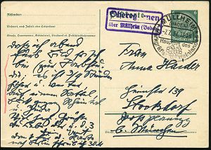 5751 | 15 € | POSTLEITRAUM 7800 (OHNE FREIBURG) : Obereggenen/ über Müllheim (Baden) 1937 (7.7.) viol. Ra.2 = PSt.II + HWSt.: MÜLLHEIM78BADEN9/Hauptort des/Markgräfler Weinlandes (Weintraube) Bedarfs-Kt. (Bo.1 Letztjahr!) | ![]() | |