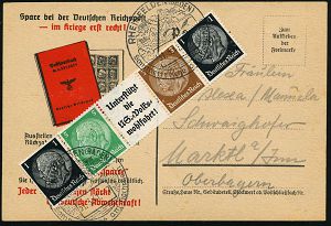 5757 | 28 € | POSTLEITRAUM 7800 (OHNE FREIBURG) : RHEINFELDEN (BADEN)/ Sommerfrische.. 1941 (31.3.) HWSt 2x auf Automatenstreifen Hindenburg 1 Pf. + 5 Pf. + Zf. NSV + 43 Pf. + 1 Pf. (Mi.A 8 b) Reklame-Kt.: Spare bei der Deutschen Reichspost - im Kriege erst recht!.. (Postsparkarte) Bedarf!, seltener Beleg! (Bo.1) | ![]() | |