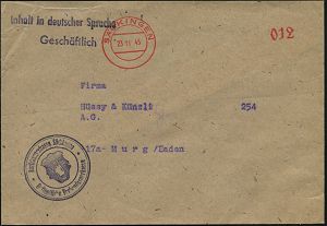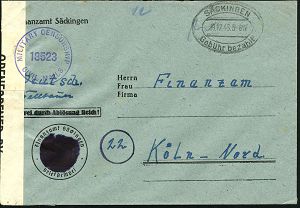 5769 | 20 € | POSTLEITRAUM 7800 (OHNE FREIBURG) : SÄCKINGINGEN/ Gebühr bezahlt 1945 (19.12.) schw. Doppel-Oval-PFS + viol. brit. Eingangs-Zensur-1K: MILITARY CENSOR-SHIP/ 18523.. (= Bonn) + Zensurstreifen PSS. 2411. 8.45 2000M (Rie.B-5, B-100) entnazifizierter Dienst-Bf.: Finanzamt Säckingen, Frei durch Ablösung Reich (gestrichen) Inl.-Zensur-Bf. ohne Ablösung! (Bo.20) | ![]() ![]() | |