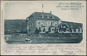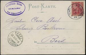 5781 | 18 € | POSTLEITRAUM 7800 (OHNE FREIBURG) : Schönau / Belchen 1900 (20.9.) 1K: SCHÖNAU (WIESENTHAL) auf 10 Pf. Germania "Reichspost" + viol., ovaler PSt.II-Stpl.: Posthülfsstelle Belchen/ 1415 Mt. ü. d. Meer.. , passende s/w.-Foto-Ak.: Belchen Gasthof n. Basel (Mi.56 EF) | ![]() ![]() | |