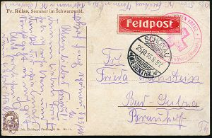 5782 | 12 € | POSTLEITRAUM 7800 (OHNE FREIBURG) : SCHÖNAU/ *(WIESENTHAL)/ a 1916 (25.10.) 1K-Gitter + roter 2K-HdN: VEREINSLAZARETT VOM ROTEN KREUZ/SCHÖNAU (Wiesenthal) + rotes Feldpost-Label, Feldpost-Künstler-Ak. n. Bad Sulza | ![]() | |
