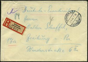 5783 | 15 € | POSTLEITRAUM 7800 (OHNE FREIBURG) : SCHÖNAU/ b/ (SCHWARZWALD) 1946 (2.3.) 1K-Brücke + RZ: (17 a)/Schönau/(Schwarzwald) + viol. Ra.: Gebühr/bezahlt, Inl.-R-Bf. n. Freiburg/Br. | ![]() | |