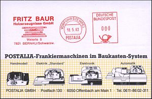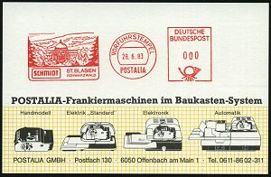 5776 | 16 € | POSTLEITRAUM 7800 (OHNE FREIBURG) : Sankt Blasien 1983 (28.6.) AFS.: VORFÜHRSTEMPEL/POSTALIA/SCHMIDT.. (Kurhaus im Schwarzwald) seltene Postalia-Musterkt.! (= Specimen) | ![]() | |