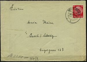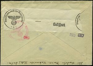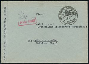 5828 | 35 € | POSTLEITRAUM 7800 (OHNE FREIBURG) : WEHR (BADEN)/ b 1941 (9.10.) 2K-Steg auf EF 12 Pf. Hindenbg. + rs. OKW-Zensurstreifen: "Geöffnet/e" + roter 1K = Frankfurt/Main ! (Rie.E-3, E-52) Ausl.-Zensur-Bf. nach Basel = Grenz-Tarif = Inlands-Tarif!, seltener Beleg! (Mi.519 EF, Sonder-Tarif!) | ![]() ![]() | |