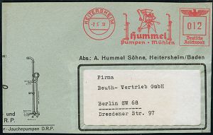5698 | 16 € | POSTLEITRAUM 7800 (OHNE FREIBURG) : HEITERSHEIM/ Hummel/ Pumpen-Mühlen 1938 (2.5.) dekorativer AFS Francotyp "Reichsadler" = Rohrleitungen/Zerkleinerer m. Gebläse , klar gest. Teil-Vorderseite (Dü.-5CGo) | ![]() | |