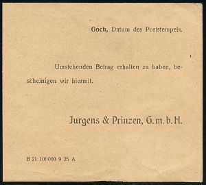 5677 | 20 € | POSTLEITRAUM 7800 (OHNE FREIBURG) : ENDINGEN/ (KAISERSTUHL) 1925 (21.12.) 1K-Gitter als Ank.-Stpl. auf Inl.-NN-Karte, frankiert mit AFS.: GOCH mit 013 Pf. = seltene Portostufe! (Fa. Jurgens & Prinzen) n. Endingen (Dü.E-1A) | ![]() ![]() | |