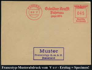 5680 | 35 € | POSTLEITRAUM 7800 (OHNE FREIBURG) : FAHRNAU/ Gebrüder Krafft/ ..gegr.1854 1937 (20.8.) AFS-Musterabdruck Francotyp "Reichsadler" , glasklar gest. Francotyp-Musterblatt vom V o r - Ersttag ! (mit Attest), selten! (Dü.E-5CGo) | ![]() ![]() | |
