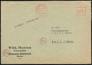 5696 | 25 € | POSTLEITRAUM 7800 (OHNE FREIBURG) : HAUSEN (WIESENTAL) 1945 (27.11.) aptierter AFS Francotyp "Reichsadler" = entfernt + Inschrift (nur Mittelrahmen) und o h n e Werbeklischee = Notmaßnahme! , Firmen-Bf.: Wilh. Menton. Walzenmühle.. n. Weil (Dü.E-13 AU-129o = seltene Type!) | ![]() | |