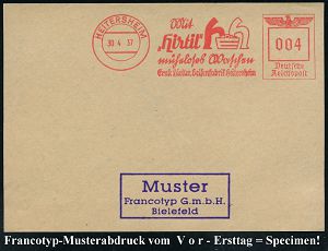 5697 | 35 € | POSTLEITRAUM 7800 (OHNE FREIBURG) : HEITERSHEIM/ Mit/ Hirtil/ mühelos Waschen/ Ernst Hirtler,Seifenfabrik.. 1937 (30.4.) AFS-Musterabdruck Francotyp "Reichsadler" (Firmen-Logo mit Waschzuber) glasklar gest. Francotyp-Musterblatt vom V o r - Ersttag ! (mit Attest), selten! (Dü.E-5CGo) | ![]() ![]() | |