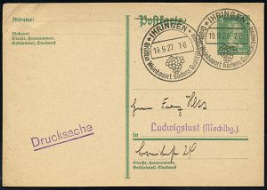 5711 | 15 € | POSTLEITRAUM 7800 (OHNE FREIBURG) : IHRINGEN/ Größter Weinbauort Badens Qualitätsweine 1927 (19.9.) HWSt (Weintraube) klar gest. Inl.-Karte (Bo.1 Erstjahr) | ![]() | |