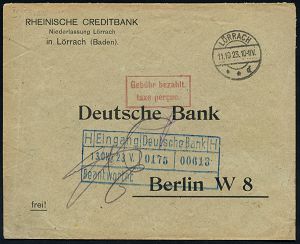 5723 | 25 € | POSTLEITRAUM 7800 (OHNE FREIBURG) : LÖRRACH/ **d 1923 (11.10.) 1K-Brücke + roter Ra.2: Gebühr bezahlt./ taxe percue = Hoch-Inflation (Markenmangel) Firmen-Bf.: RHEINISCHE CREDITBANK.. an Deutsche Bank, Berlin (Mi.+ 40.- EUR, 2017) | ![]() | |