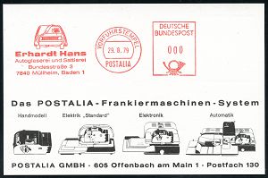 5744 | 18 € | POSTLEITRAUM 7800 (OHNE FREIBURG) : 7840 Müllheim,Baden 1 1979 (29.8.) AFS: VORFÜHRSTEMPEL/POSTALIA/Erhardt Hans/Autoglaserei.. (Auto m.zerbrochener Windschutzscheibe) seltene Postalia-Musterkt. (= Specimen) | ![]() | |