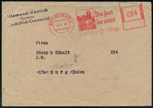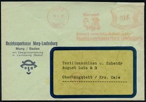 5747 | 28 € | POSTLEITRAUM 7800 (OHNE FREIBURG) : MURG/ (BADEN)/ Wer spart,/ kommt vorwärts../ Bezirkssparkasse Murg.. 1947 (19.2.) aptierter AFS Francotyp "Bogenrechteck" = Inschrift DEUTSCHES REICH entfernt = Notmaßnahme (Sparer mit Sparbuch) Firmen-Bf. (rs. Klappe fehlt), (Dü.E-10A-51o = seltene Type) | ![]() | |