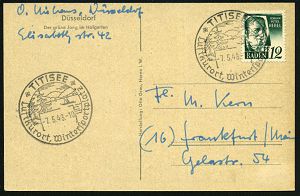 5799 | 12 € | POSTLEITRAUM 7800 (OHNE FREIBURG) : TITISEE/ Luftkurort,Wintersportplatz 1948 (7.5.) HWSt = Angler (im Boot) EF 12 Pf. Baden J.P. Hebel, Bedarfs-Kt., seltene Verwendungszeit!, ex Heyd-Slg. (Bo.2) | ![]() | |