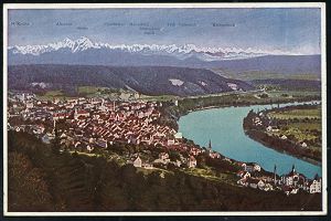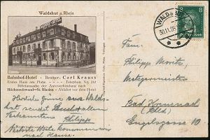 5818 | 18 € | POSTLEITRAUM 7800 (OHNE FREIBURG) : WALDSHUT/ **a 1928 (30.11.) 1K-Brücke auf Color-Ak.: Waldshut (Gesamtansicht) anschriftenseitig s/w.-Abb.: Bahnhof-Hotel, Bedarf (Mi.389) | ![]() ![]() | |