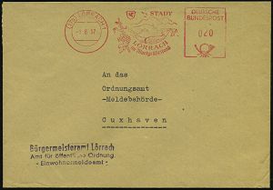 5730 | 10 € | POSTLEITRAUM 7800 (OHNE FREIBURG) : (17b) LÖRRACH 1/ STADT/ LÖRRACH/ im Markgräflerland 1957 (1.8.) AFS Postalia = Weinstock m. Traube (u. Ortsbild) + Abs.-3L: Bürgermeister Lörrach.., Fernbf. (Dü.E-23B) | ![]() | |
