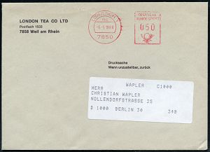 5737 | 8 € | POSTLEITRAUM 7800 (OHNE FREIBURG) : 7850 LÖRRACH 1/ mc/ DEUTSCHE/ BUNDESPOST 1988 (6.5.) PFS "Posthorn" , Jahreszahl vierstellig ohne Uhrzeit 050 Pf. auf Firmen-Bf.: LONDON TEA CO LTD.. 7858 Weil am Rhein (Dü.D-17) | ![]() | |