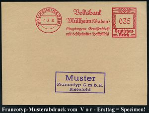 5740 | 35 € | POSTLEITRAUM 7800 (OHNE FREIBURG) : MÜLLHEIM (BADEN)/ Volksbank/ Müllheim.. 1935 (1.3.) AFS-Musterabdruck Francotyp "Hakenkreuz" , glasklar gest. Francotyp-Musterblatt vom V o r - Ersttag ! (mit Attest), selten! (Dü.E-3CEo) | ![]() ![]() | |