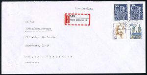 5745 | 10 € | POSTLEITRAUM 7800 (OHNE FREIBURG) : 79379 MÜLLHEIM,BADEN 16/ a 1994 (Nov.) 1K-Segment auf MiF Freimarken 450 Pf. + Selbstkleber-RZ: 79379 Müllheim 16 , Inl.-R-Bf. | ![]() | |