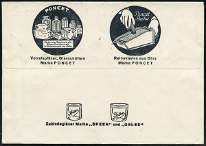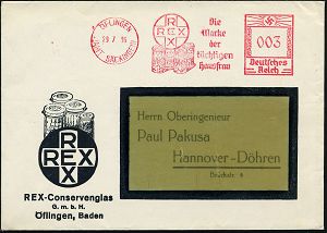 5752 | 25 € | POSTLEITRAUM 7800 (OHNE FREIBURG) : ÖFLINGEN/ (AMT SÄCKINGEN)/ REX/ Die/ Marke/ d./ tüchtigen/ Hausfrau 1936 (29.7.) AFS Francotyp "Hakenkreuz" (4 Einmachgläser mit Obst u.Gemüse) auf motiv-ähnl. Reklame-Bf. + rs. Glasprodukt-Reklame, dekorativer Beleg! (Dü.E-3CEo) | ![]() ![]() | |