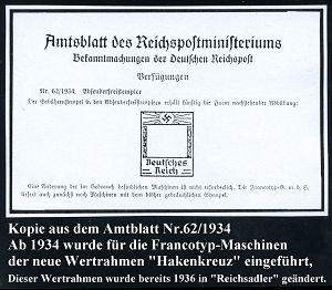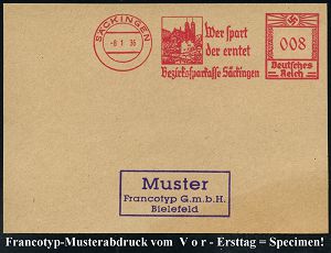 5762 | 35 € | POSTLEITRAUM 7800 (OHNE FREIBURG) : SÄCKINGEN/ Wer spart/ der erntet/ Bezirkssparkasse.. 1936 (8.1.) AFS-Musterabdruck Francotyp "Hakenkreuz" (Kirche) glasklar gest. Francotyp-Musterblatt vom V o r - Ersttag !, (mit Attest), selten! (Dü.E-3CEo) | ![]() ![]() | |