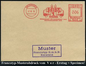 5763 | 35 € | POSTLEITRAUM 7800 (OHNE FREIBURG) : SÄCKINGEN/ SEIBA/ ..GESELLSCHAFT FÜR SEIDENSTOFF-UND/ BANDFABRIKATION MBH 1936 (17.10.) AFS-Musterabdruck Francotyp "Hakenkreuz" (Kirchtürme, Trompeter u. Band) glasklar gest. Francotyp-Musterblatt vom V o r - Ersttag ! (mit Attest), selten! (Dü.E-3CEo) | ![]() ![]() | |