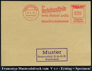 5766 | 35 € | POSTLEITRAUM 7800 (OHNE FREIBURG) : SÄCKINGEN/ Die/ Acetatkunstseide../ Lonzona AG. für Acetatprodukte 1938 (28.9.) AFS-Musterabdruck Francotyp "Reichsadler" , glasklar gest. Francotyp-Musterblatt vom V o r - Ersttag ! (mit Attest), selten! (Dü.E-5CGo) | ![]() ![]() | |