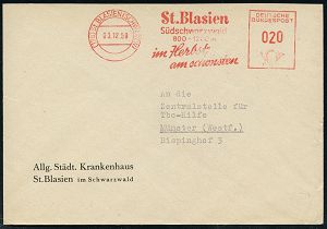 5774 | 10 € | POSTLEITRAUM 7800 (OHNE FREIBURG) : (17b) St BLASIEN (SCHWARZW)/ St.Blasien/ ..im Herbst/ am schönsten 1959 (3.12.) AFS Francotyp auf Dienst-Bf.: Allg.Städt. Krankenhaus.. (Dü.E-23CO) | ![]() | |