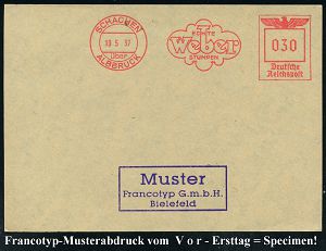 5780 | 35 € | POSTLEITRAUM 7800 (OHNE FREIBURG) : SCHACHEN/ über/ ALBBRUCK/ ECHTE/ weber/ STUMPEN 1937 (19.5.) AFS-Musterabdruck Francotyp "Reichsadler" (Firmen-Logo = Zigarren-Manufaktur) glasklar gest. Francotyp-Musterblatt vom V o r - Ersttag ! (mit Attest), selten! (Dü.E-5CGo) | ![]() ![]() | |