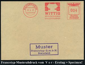 5784 | 35 € | POSTLEITRAUM 7800 (OHNE FREIBURG) : SCHOPFHEIM/ WITIIG/ KOMPRESSOREN/ VAKUUMPUMPEN 1937 (31.5.) AFS-Musterabdruck Francotyp "Reichsadler" (Maschinen-Logo) glasklar gest. Francotyp-Musterblatt vom V o r - Ersttag ! (mit Attest), selten! (Dü.E-5CGo) | ![]() ![]() | |
