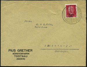 5802 | 18 € | POSTLEITRAUM 7800 (OHNE FREIBURG) : TODTNAU/ Luftkurort/ Die Wiege des deutschen Skisportes 1930 (1.8.) HWSt auf Firmen-Bf.: PIUS GRETHER BÜRSTENFABRIK (Bo.2 , Bochmann 1930 unbekannt) | ![]() | |
