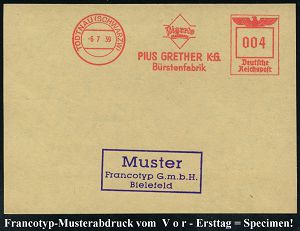 5809 | 35 € | POSTLEITRAUM 7800 (OHNE FREIBURG) : TODTNAU (SCHWARZW)/ Pigeto../ PIUS GRETHER KG/ Bürstenfabrik 1939 (6.7.) AFS-Musterabdruck Francotyp "Reichsadler" (Firmen-Logo) glasklar gest. Francotyp-Musterblatt vom V o r - Ersttag ! (mit Attest), selten! (Dü.E-5CGo) | ![]() ![]() | |