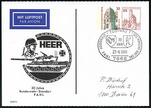 5814 | 14 € | POSTLEITRAUM 7800 (OHNE FREIBURG) : 7868 TODTNAU 1/ 30 JAHRE/ STANDORT FAHL.. 1991 (23.6.) SSt (Wappen) auf PP 30 Pf. + 35 Pf. Burgen: HEER, 30 Jahre Bundeswehrstandort FAHL (Leopard I etc.) Inl.-Flp.-Kt. (Mi.PP 102/3, Berlin) | ![]() | |