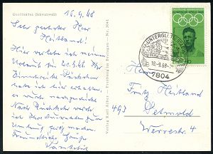 5815 | 8 € | POSTLEITRAUM 7800 (OHNE FREIBURG) : 7804 UNTERGLOTTERTAL/ Erholung im Kur-u.Winterort.. 1968 (18.9.) HWSt (Weintraube etc.)auf EF 20 + 10 Pf. Olympia , Color-Foto-Ak.: Glottertal, Bedarf (Mi.561 EF + 6.- EUR) | ![]() ![]() | |