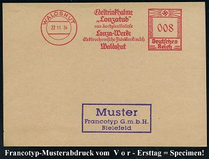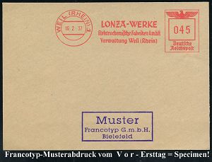 5836 | 35 € | POSTLEITRAUM 7800 (OHNE FREIBURG) : WEIL (RHEIN) 1/ LONZA-WERKE/ Elektrotechnische Fabriken.. 1937 (16.2.) AFS-Musterabdruck Francotyp "Reichsadler" , glasklar gest. Francotyp-Musterblatt vom V o r - Ersttag ! (mit Attest), selten! (Dü.E-5CGo) | ![]() ![]() | |