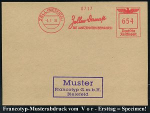 5843 | 35 € | POSTLEITRAUM 7800 (OHNE FREIBURG) : ZELL (WIESENTAL)/ Zeller Damast.. 1938 (5.1.) AFS-Musterabdruck Francotyp "Reichsadler" , Text teils Sütterlin, glasklar gest. Francotyp-Musterblatt vom V o r - Ersttag ! (mit Attest), selten! (Dü.E-5CGh) | ![]() ![]() | |
