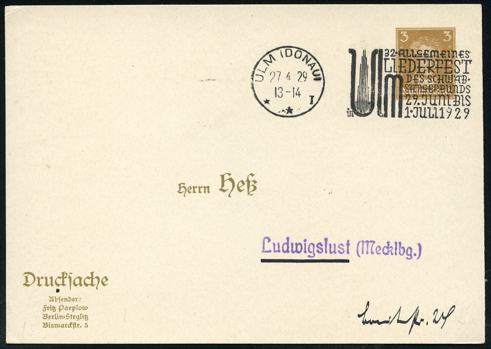 5860 | 18 € | 7900 ULM : ULM (DONAU)/ **I/ 32.ALLGEMEINES/ LIEDERFEST/ DES SCHWÄB./ SÄNGERBUNDES 1929 (27.4.) MWSt (gr. "U" m. Münster-Turm) auf PP 3 Pf. Goethe, braun (Heß, Mi.PP 97/B 6-027) Inl.-Karte (Bo.5 B I) | ![]() | |