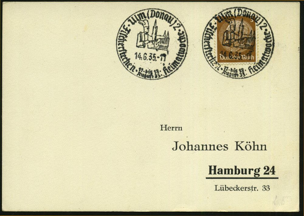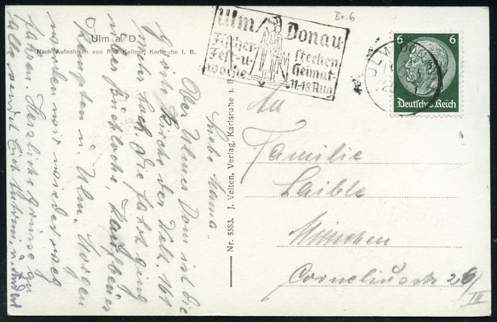 5864 | 15 € | 7900 ULM : Ulm (Donau) 2/ Fischerstechen/ Heimatwoche 1935 (Juni) HWSt = Fischer in Zunfttracht mit Lanze (u. Dom) klar gest. Inl.-Karte (Bo.7) | ![]() | |