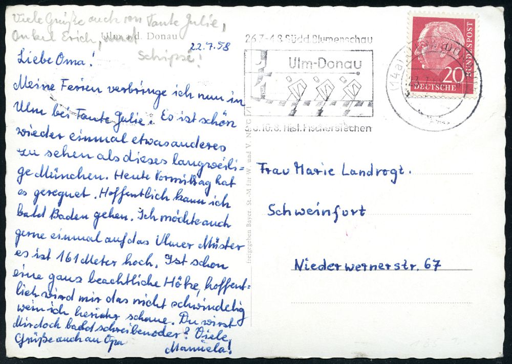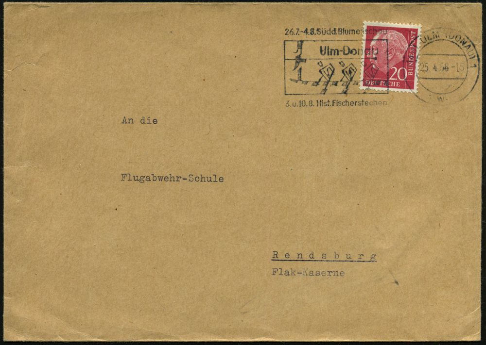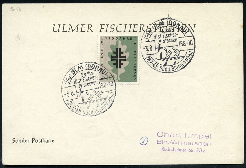 5873 | 18 € | 7900 ULM : (14a) ULM (DONAU)/ Histor.Fischer-/ stechen/ ..Südd.Blumenschau 1958 (3.8.) SSt (stlilis. Fischerstechen) dekorative, motivgl. Sonder-Kt.: Fischerstechen, Michaelis unbekannt! (Bo.26) | ![]() ![]() | |